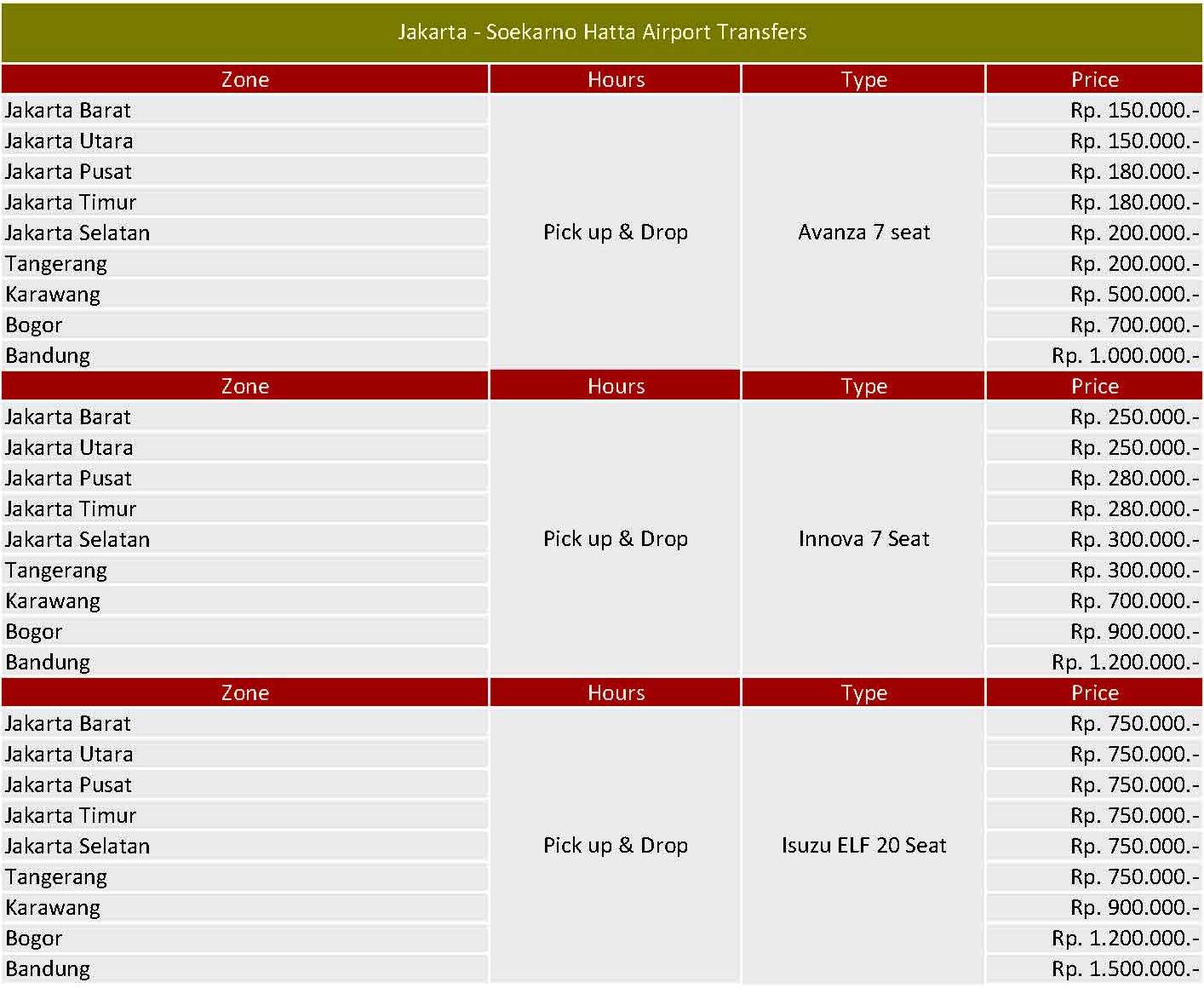 Our price is the price for one way and picked up from the Airport Soekarno Hatta and surrounding : Cengkareng, Pluit, Daan Mogot, Grogol, Gajah Mada